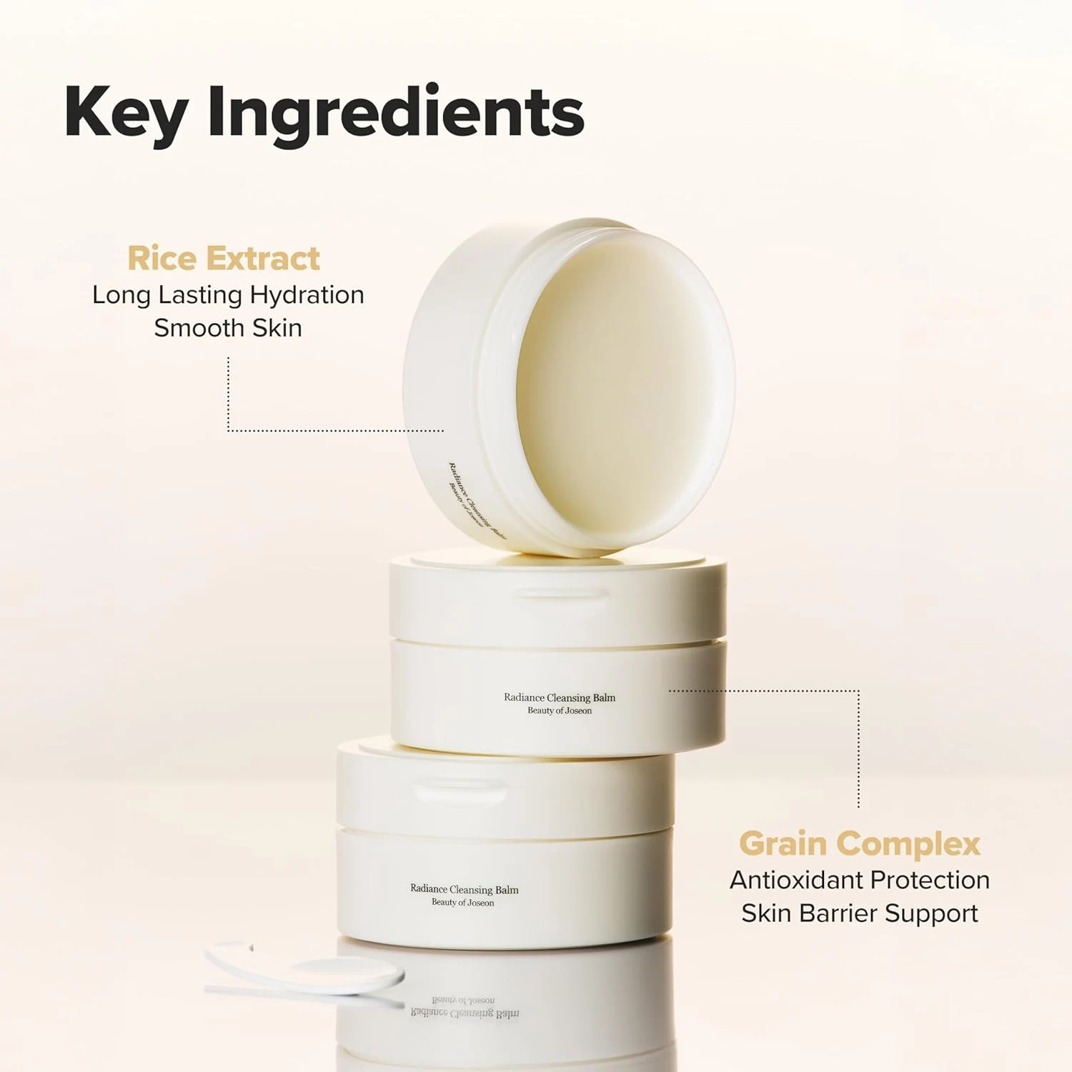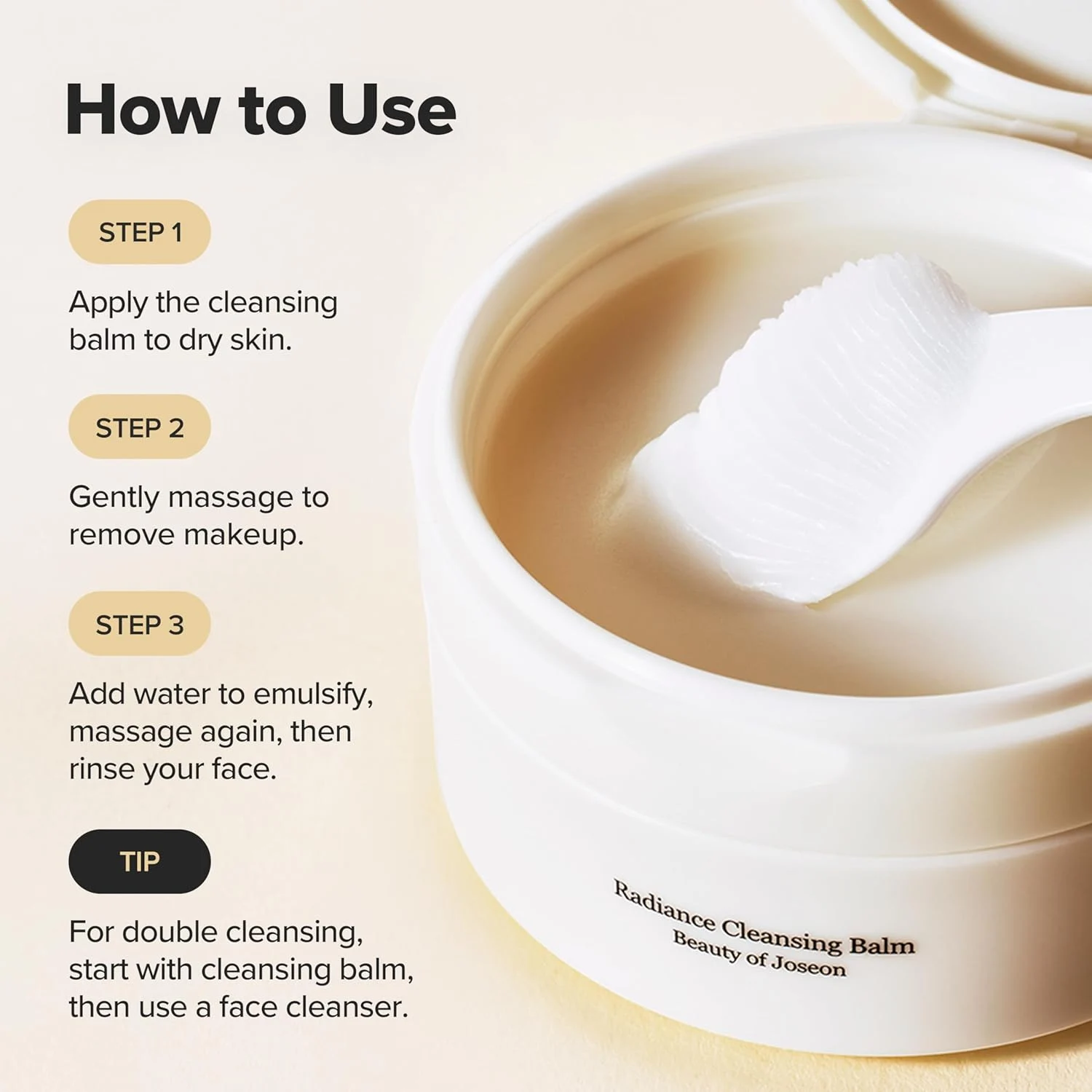 Beauty of Joseon Radiance Cleansing Balm is a balm-to-oil cleanser that melts on skin to dissolve waterproof makeup, sunscreen, excess sebum, and daily impurities. It warms as you massage, then breaks down makeup fast so skin feels clean, soft, and hydrated — not tight or “stripped”.