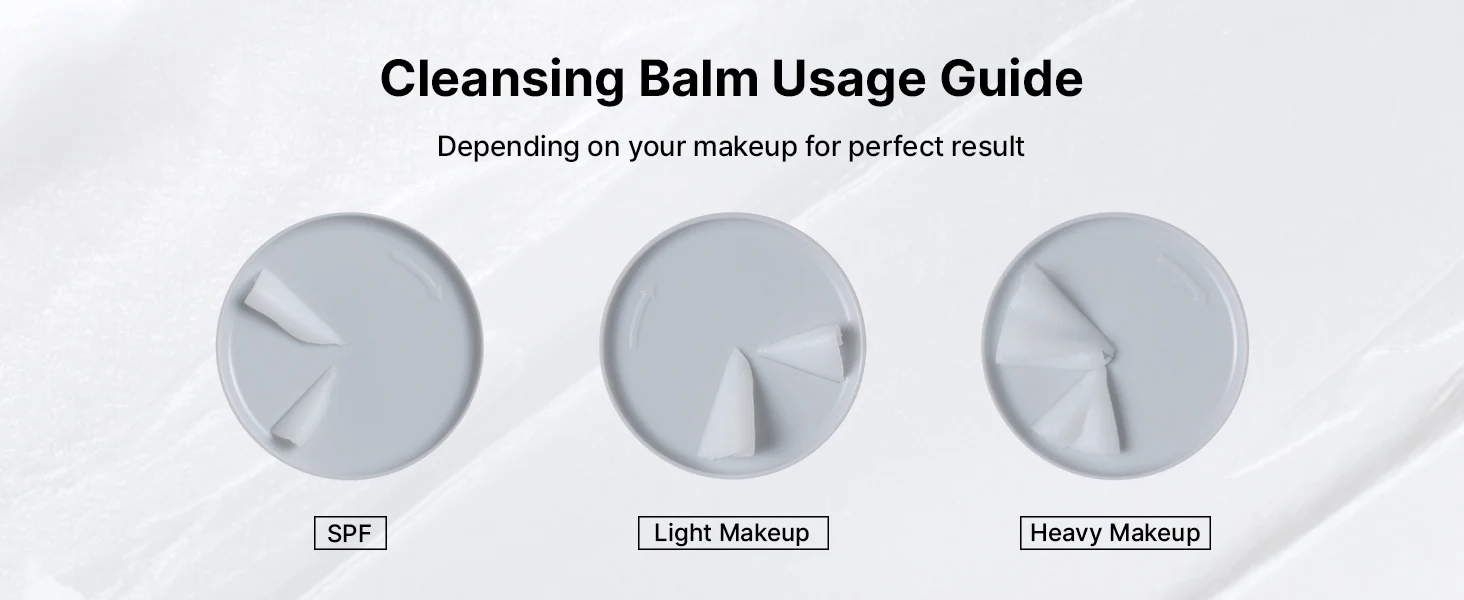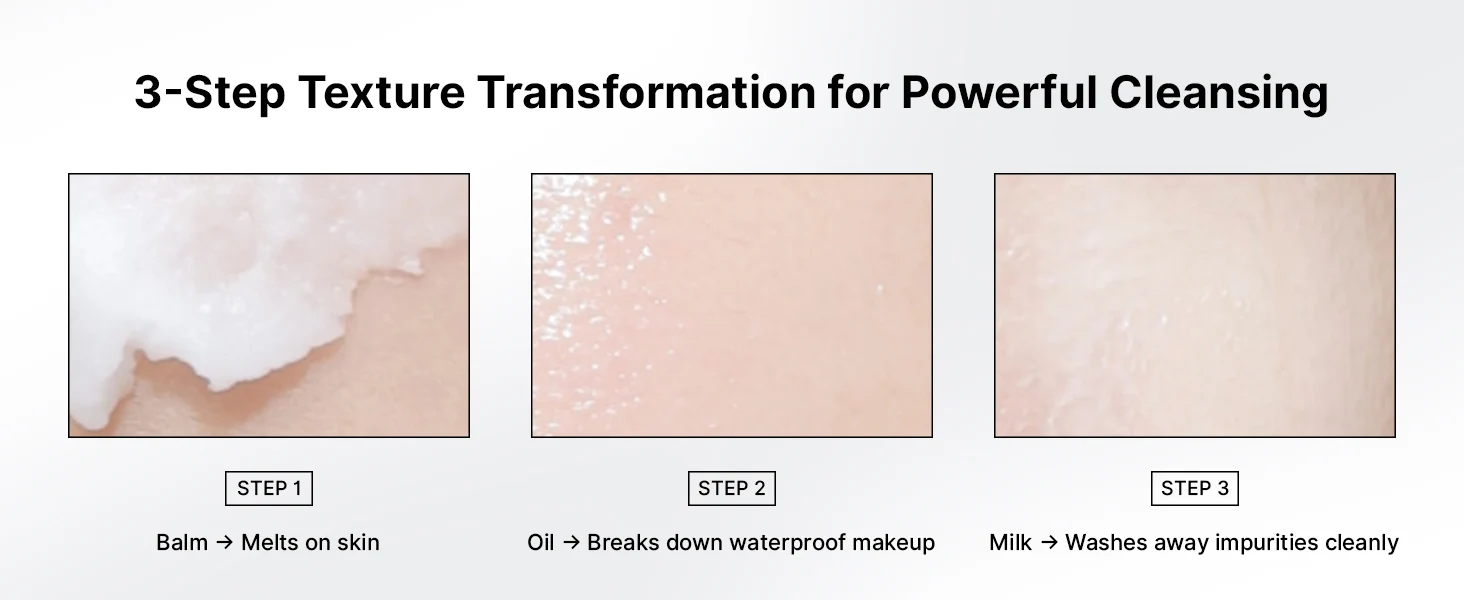 2) Massage onto dry face to melt makeup and sunscreen (balm → oil).