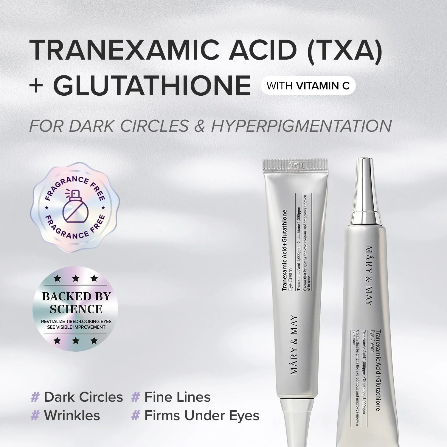 Mary&May Tranexamic Acid + Glutathione Eye Cream Mini (12g) is a brightening eye cream made to target dark circles, uneven tone, and tired-looking skin around the eyes. It combines Tranexamic Acid, Glutathione, Niacinamide, and Vitamin C to help improve clarity, reduce discoloration, and leave the eye area looking fresher and more radiant.
