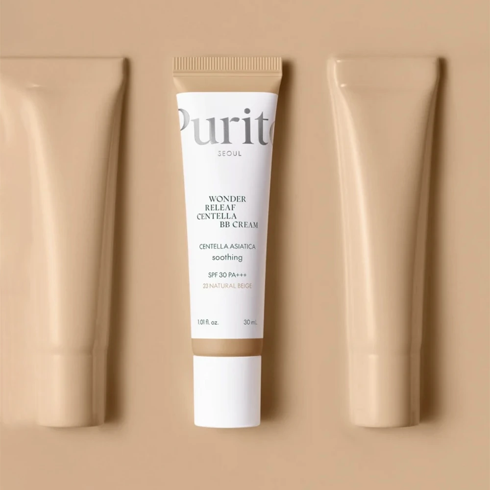 PURITO SEOUL Wonder Releaf Centella BB Cream #23 Natural Beige is a high-coverage, skin-calming BB cream that blends makeup and skincare. It is specifically designed for sensitive skin, using Korean Centella Asiatica to rapidly soothe redness and irritation while providing a natural, semi-matte finish.