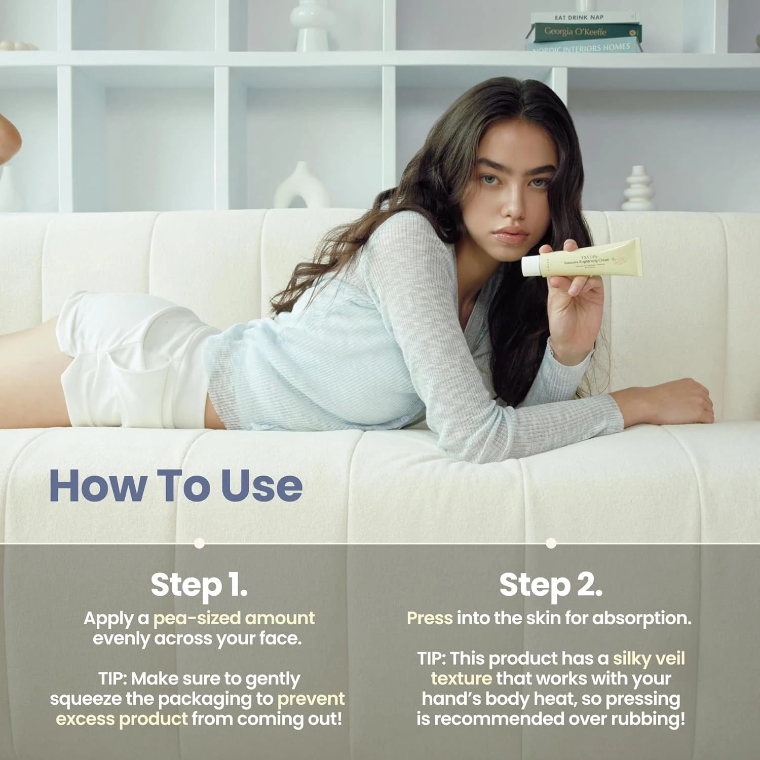 კანის მოვლის ბოლო ეტაპზე, წაისვით კანზე საკმარისი რაოდენობა და ნაზად შეიზილეთ შეწოვის გასაძლიერებლად.