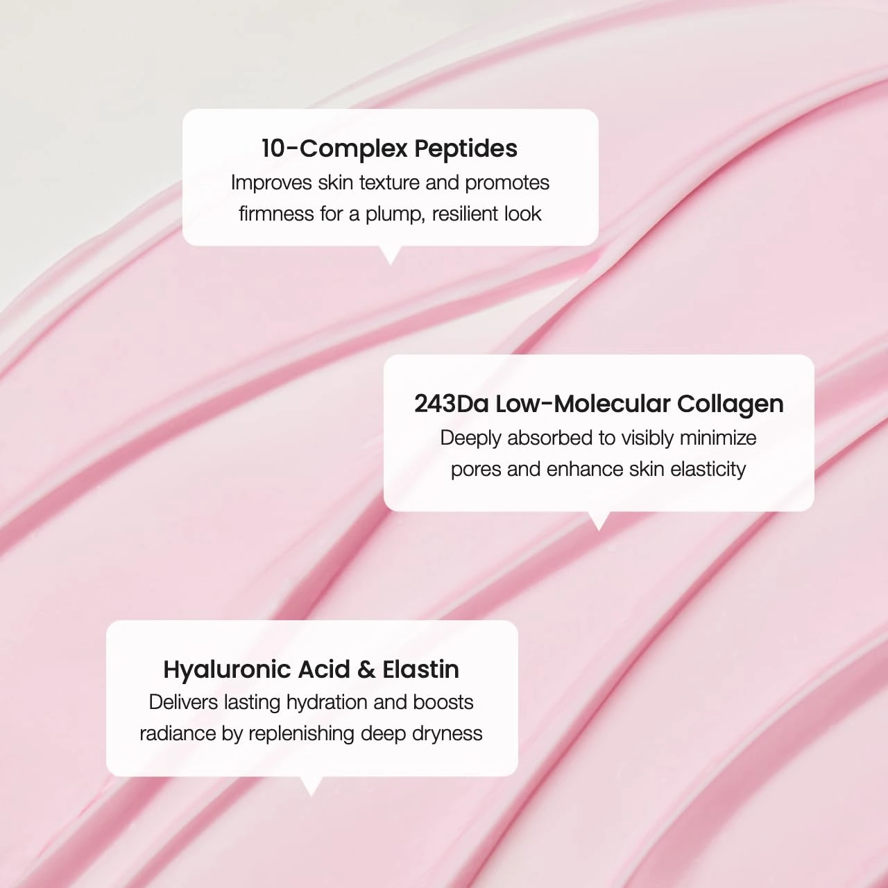1, 2-Hexanediol, Acetyl Hexapeptide-8, Adenosine, Alginic Acid, Butylene Glycol, Caprylyl Glycol, Caprylyl/Capryl Glucoside, Cetearyl Alcohol, Cetearyl Olivate, Collagen Extract, Collagen Water, Copper Tripeptide-1, Cyanocobalamin, Dimer Dilinoleyl Dimer Dilinoleate, Diphenyl Dimethicone, Disodium EDTA, Elastin, Ethylhexylglycerin, Glycerin, Glyceryl Stearate, Hexapeptide-12, Hexapeptide-9, Hyaluronic Acid, Hydrogenated Poly(C6-14 Olefin), Hydrogenated Polydecene, Hydrolyzed Elastin, Hydrolyzed Hyaluronic Acid, Hydrolyzed Sodium Hyaluronate, Hydroxypropyltrimonium Hyaluronate, Methylpropanediol, Neopentyl Glycol Diheptanoate, Niacinamide, Palmitoyl Pentapeptide-4, Palmitoyl Tripeptide-38, Palmitoyl Tripeptide-5, Panthenol, Pentapeptide-4, Pentylene Glycol, Polyisobutene, Potassium Hyaluronate, Propanediol, Sea Water, sh-Oligopeptide-1, Silanetriol, simethicone, Sodium Acetylated Hyaluronate, Sodium Acrylate/Sodium Acryloyldimethyl Taurate Copolymer, Sodium Hyaluronate, Sodium Hyaluronate Crosspolymer, Sodium Polyacrylate, Soluble Elastin, Sorbitan Oleate, Sorbitan Olivate, Tocopherol, Triethylhexanoin, Tripeptide-1, Water
