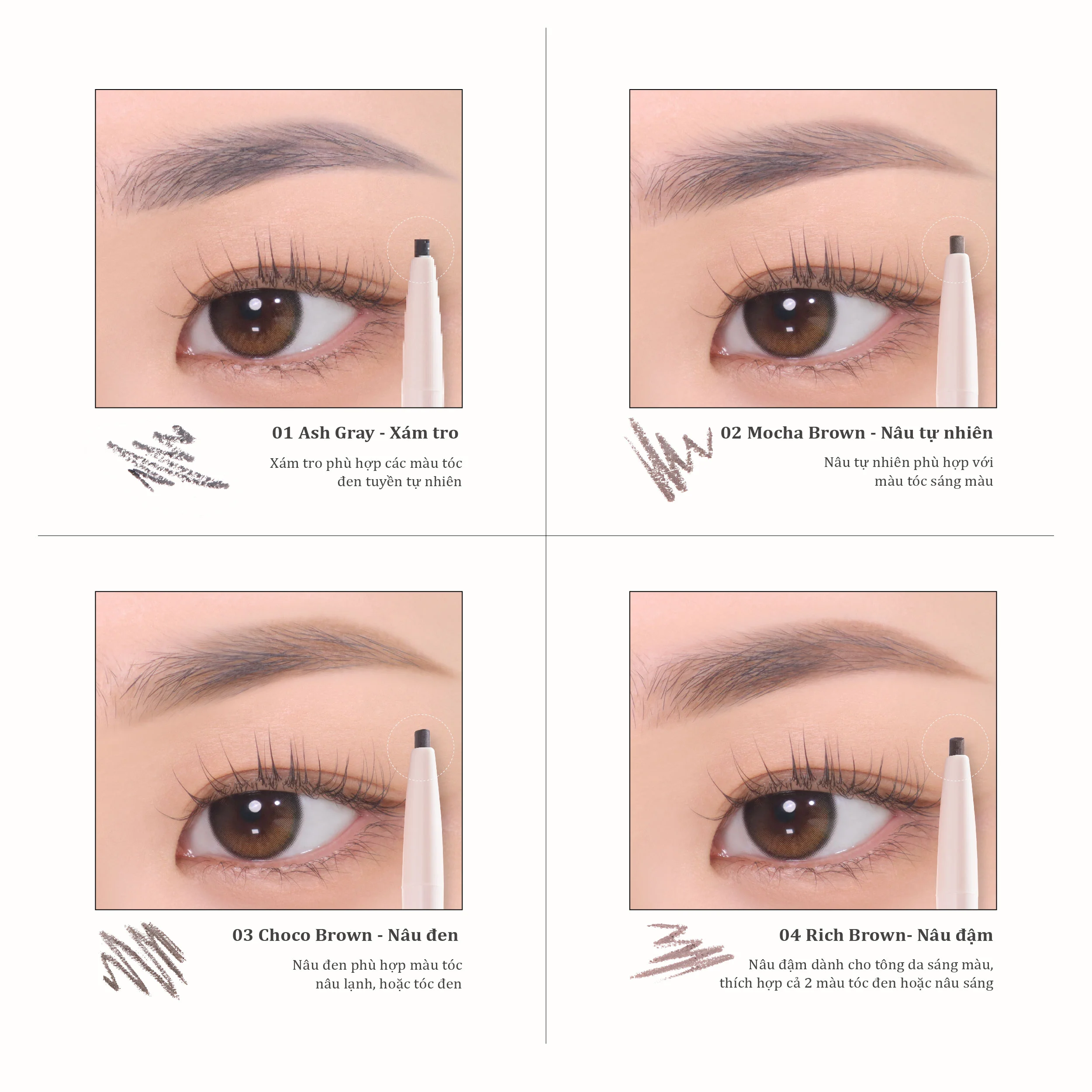 3 მმ-ის თხელი წვერი უზრუნველყოფს ზუსტ დატანას, ხოლო კრემისებური ტექსტურა მარტივად ქმნის ბუნებრივ, თმის მსგავს ხაზებს.