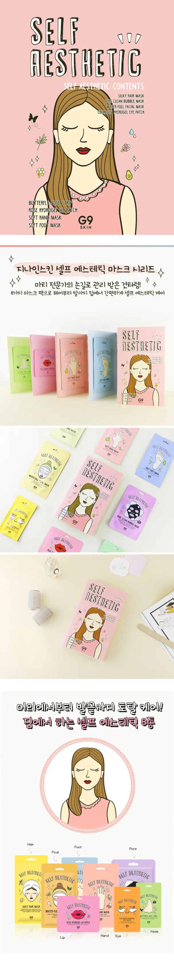G9SKIN Self Aesthetic Magazine (8 ცალი) არის კორეული, სრული სახლის სპა ნაკრები, რომელიც მოიცავს 8 სხვადასხვა ნიღბის პროცედურას თმის, სახის, ფორების, თვალების, ტუჩების, ხელებისა და ფეხებისთვის. ეს არის ძალიან მარტივი თავის მოვლის ნაკრები სახლში სპა საღამოსთვის, მოგზაურობისთვის მოსახერხებელი განებივრების ნაკრები ან საყვარელი საჩუქარი, როდესაც გსურთ სრული რუტინა ერთ ყუთში. ის შესაფერისია ყველა ტიპის კანისთვის.