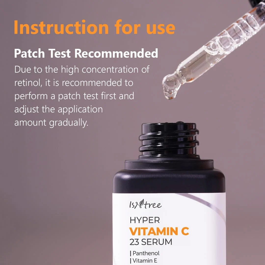 Isntree Hyper Vitamin C 23 Serum (20 მლ) – მაღალი კონცენტრაციის კორეული C ვიტამინის შრატი, რომელიც შექმნილია მუქი ლაქების, აკნეს შემდგომი ლაქების, მქრქალი კანისა და არათანაბარი ტონის სამკურნალოდ, უფრო ნათელი ბზინვარებისთვის. იგი იყენებს 23%-იან სუფთა C ვიტამინს (ასკორბინის მჟავას) უფრო თანაბარი ფერისა და ანტიოქსიდანტური დაცვის უზრუნველსაყოფად, ამასთანავე დამატებულია კანის კომფორტის ინგრედიენტები, როგორიცაა პანთენოლი და E ვიტამინი (ტოკოფეროლი), რათა კანი დატენიანებული იყოს.