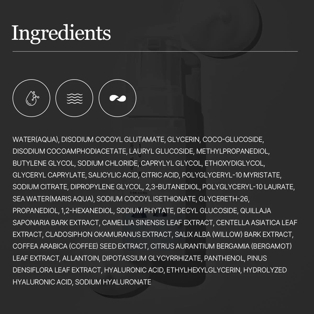 შეიცავს Ulleungdo-ს ღრმა ზღვის წყალს, რომელიც მდიდარია ბუნებრივი მინერალებით, ასევე დამატენიანებელ და დამამშვიდებელ დამხმარე ნივთიერებებს, როგორიცაა ჰიალურონის მჟავა, პანთენოლი და ალანტოინი, სუფთა, მაგრამ მშვიდი ეფექტისთვის.